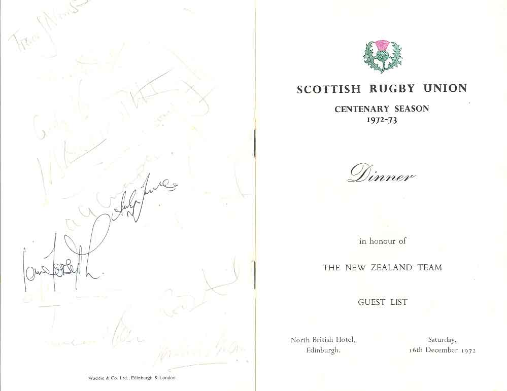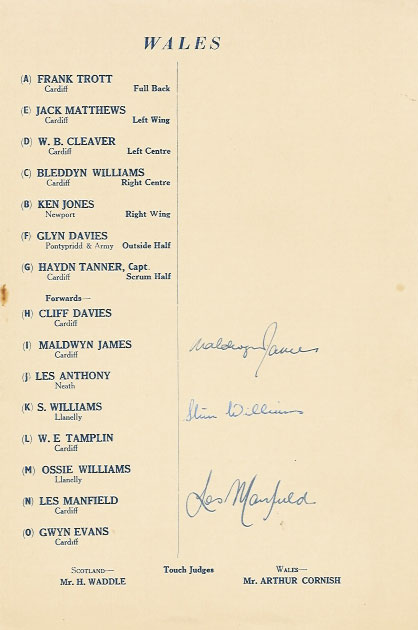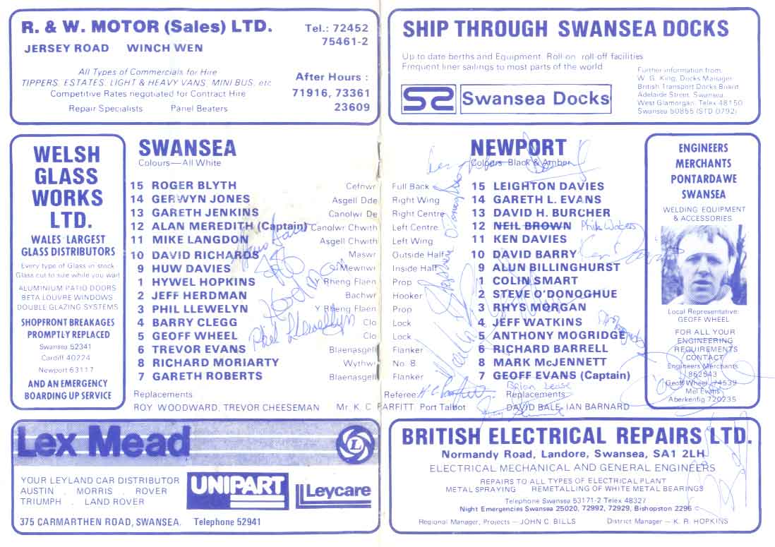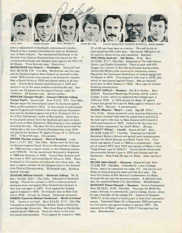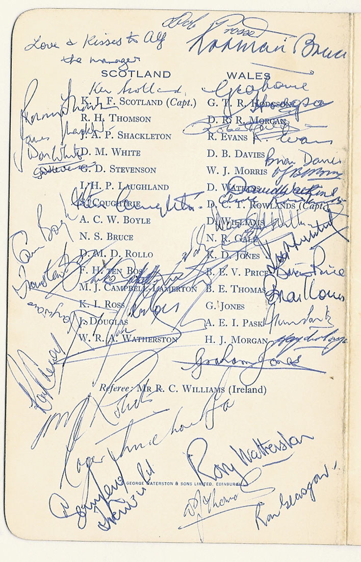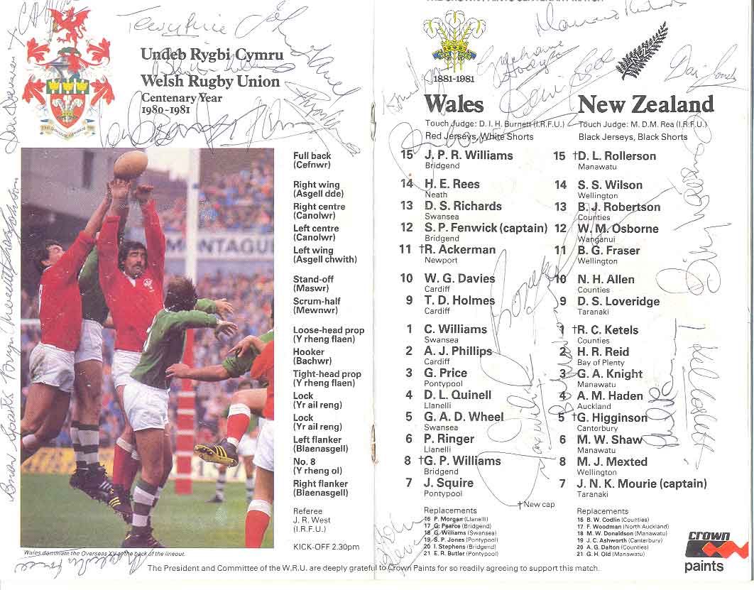 WALES v NEW ZEALAND 1 November 1980 SIGNED PROGRAMME, 68 autographs on various pages including over individual player profiles and to the middle pages. The programmes contains the signatures of many former Welsh internationals including: Bryn Meredith, Ken Jones, Terry Price, Dewi Bebb, Brian Sparks, JPR Williams, Stuart Watkins, Gerald Davies, Cliff Morgan, Denzil Williams, Roy John, Dai Morris, Derek Quinnell, Brian Price, plus All Blacks to include Wilson Whineray, Graham Mourie and Earle Kirton. The programme is in very good condition and is accompanied by a COA guaranteeing that the autographs are original and authentic. Ref: auprinfu.wanz.1980.au68 - £125.00 |