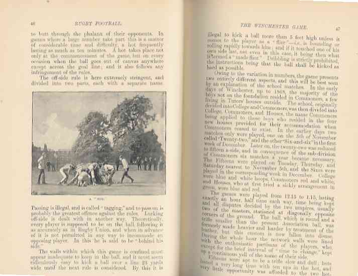 Pages 164 to 175 are dedicated to football and describes the two major football codes as Association and Rugby School. Most likely written by an association enthusiast as there is favourable byass towards this code. Lists the association rules just prior to the introduction of a specialist goalkeeper and Rugby School rules which at this stage the attempt at goal after the touchdown is extremely complicated. Summary includes a round-up of both codes as if they are one game. A small second hand hardback book without a dust wrapper, generally there is light wear to the book with minor surface damage to the advertisements at the beginning and end of the book, overall it is in good condition.