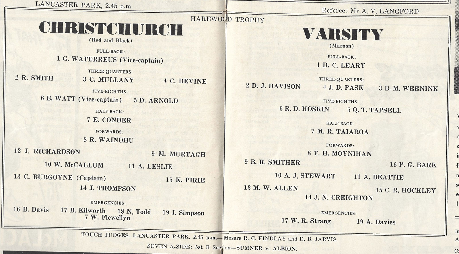 Matches include - Christchurch v High School Old Boys, Varsity v New Brighton, Technical-Shirley v Sydenham 16 pages - team info |