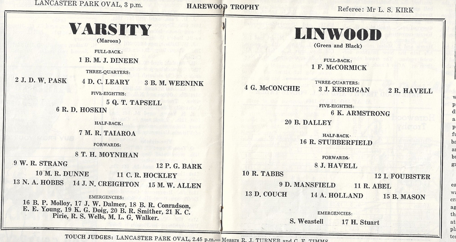 Matches include - Technical-Shirley v Varsity, Linwood v Belfast, High School Old Boys v Merivale 16 pages - team info |