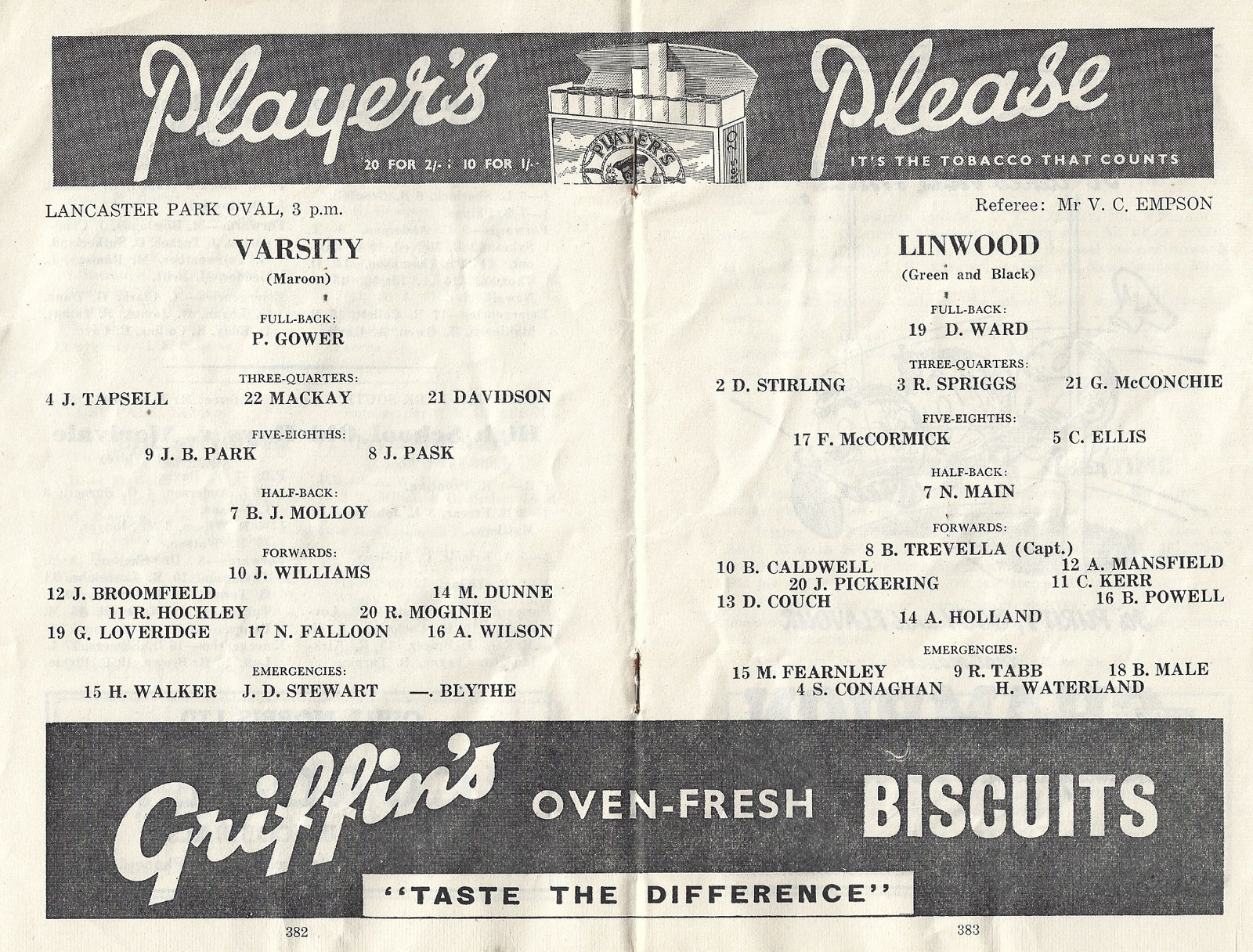 Matches include - Linwood v Christchurch. High School Old Boys v Merivale v Albion, Belfast v Varsity 16 pages - team info |