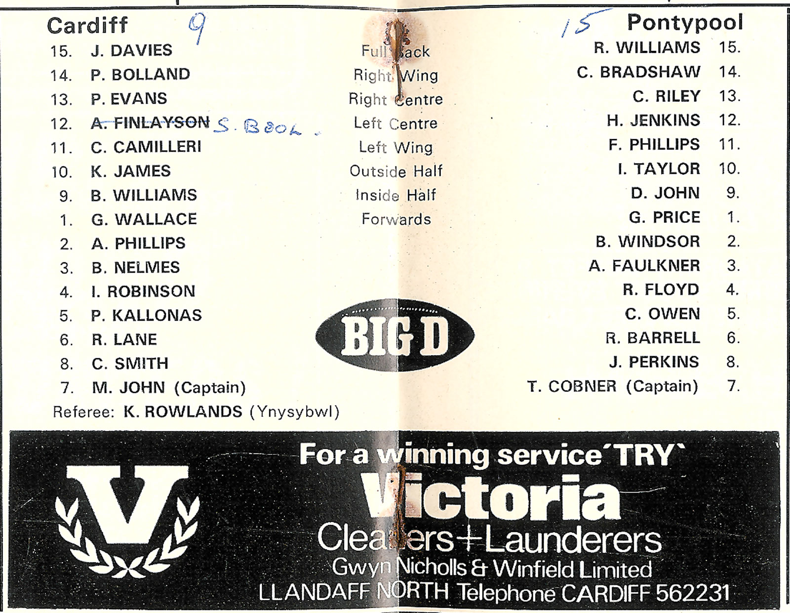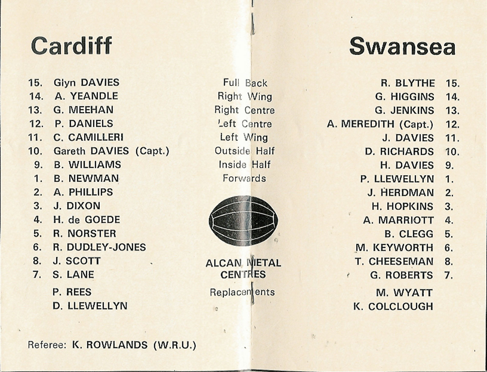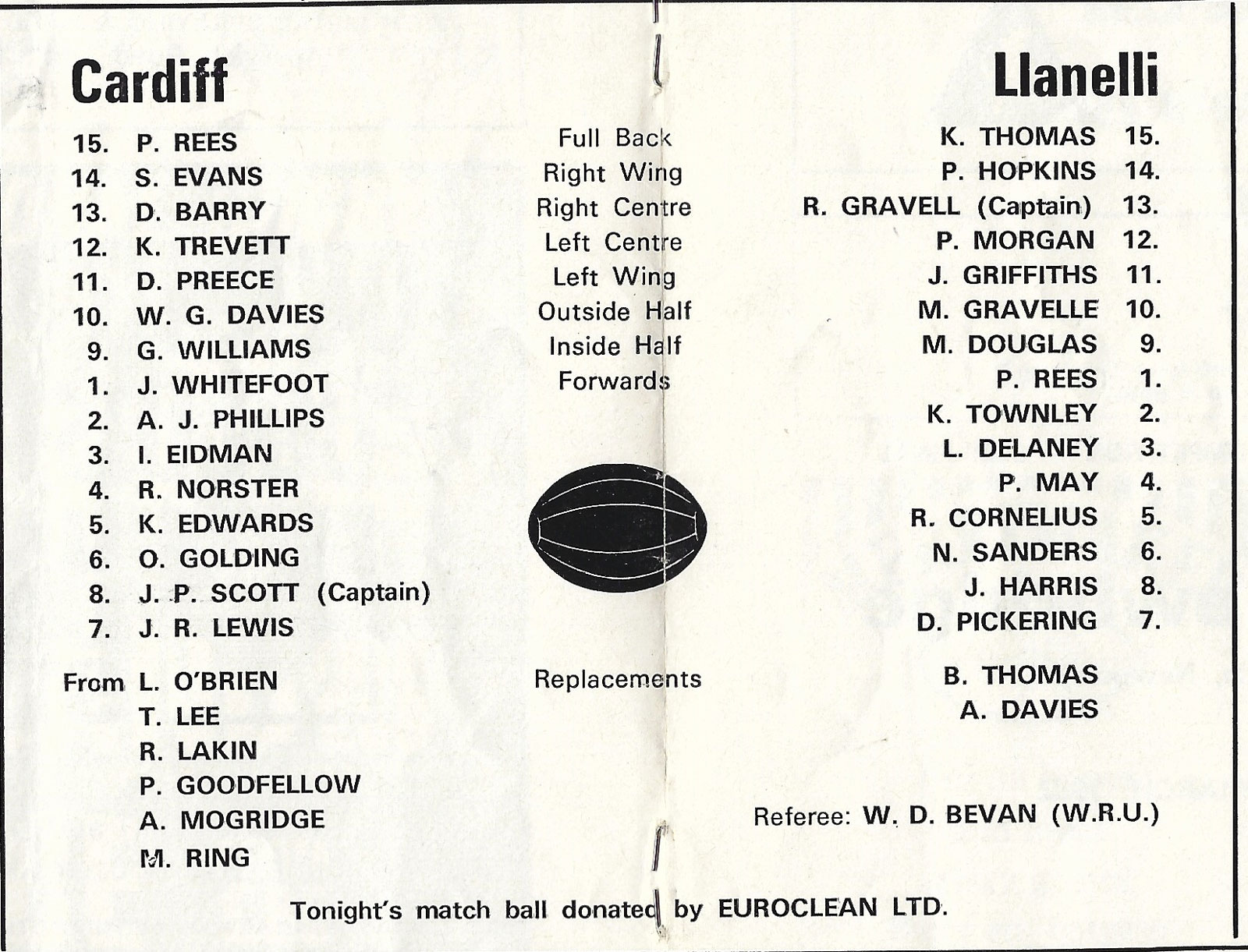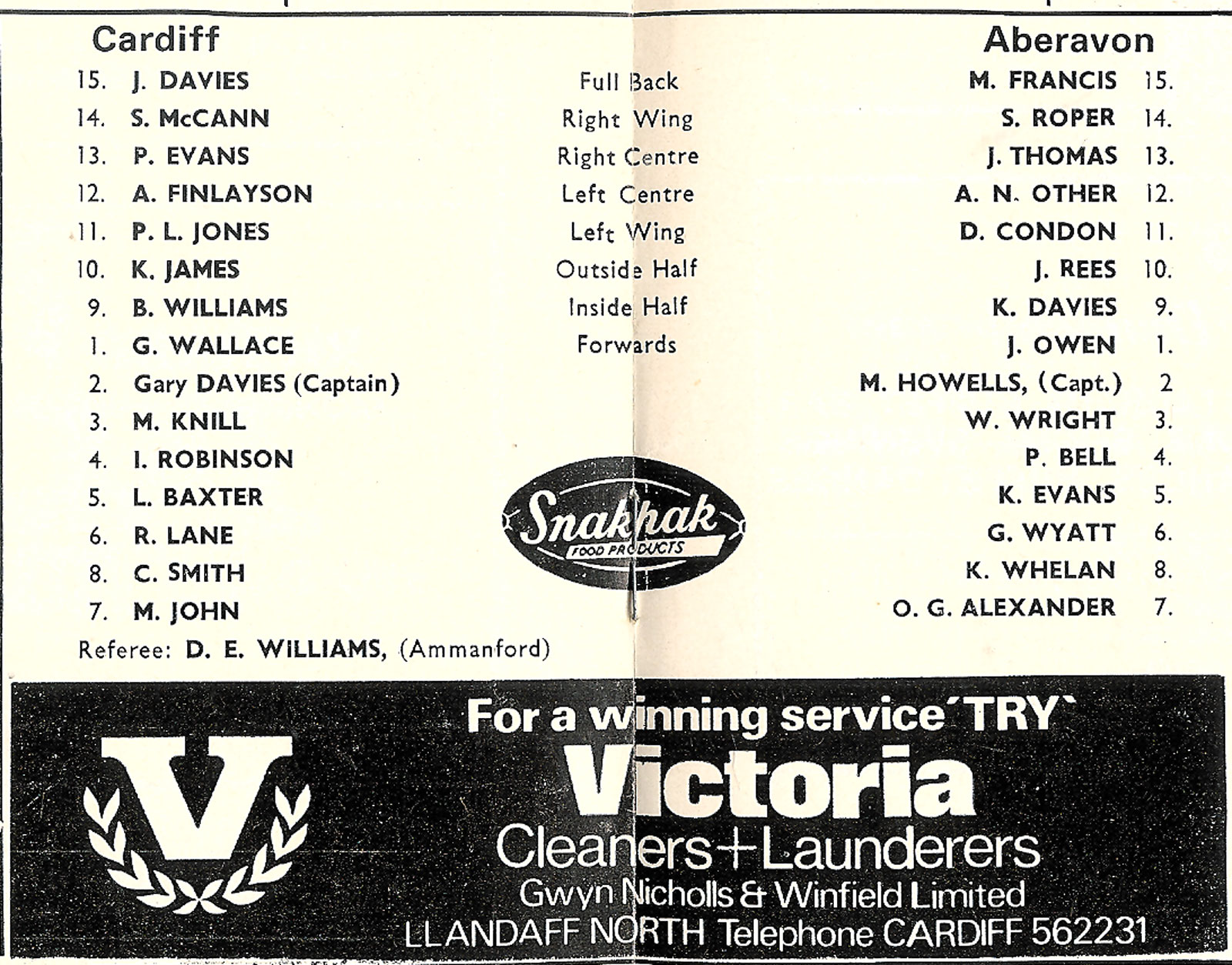 Cardiff v Aberavon | 24 Sep 1977 | Cardiff | 28-13 |