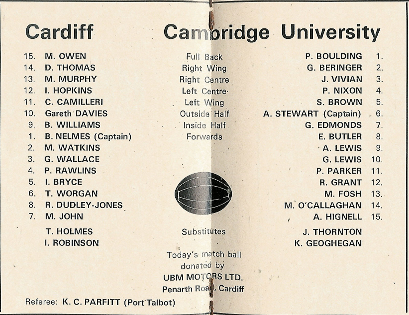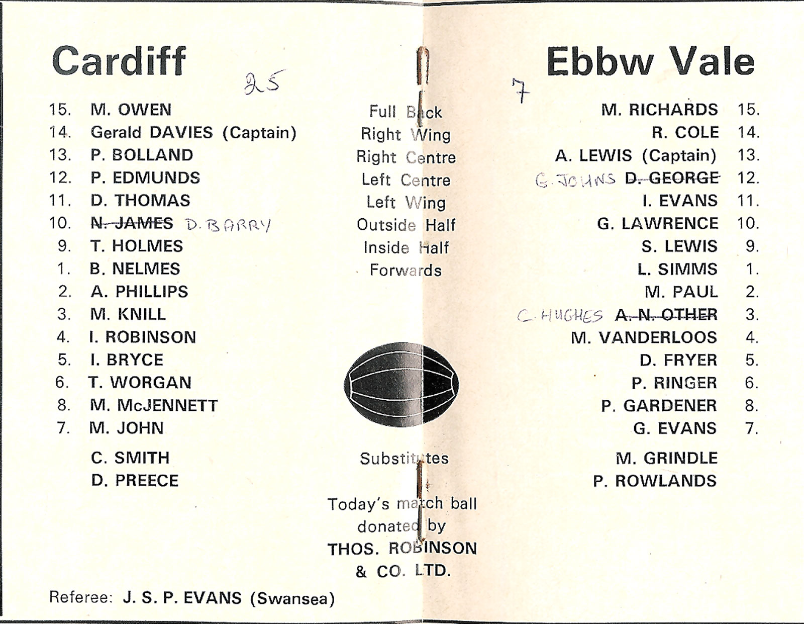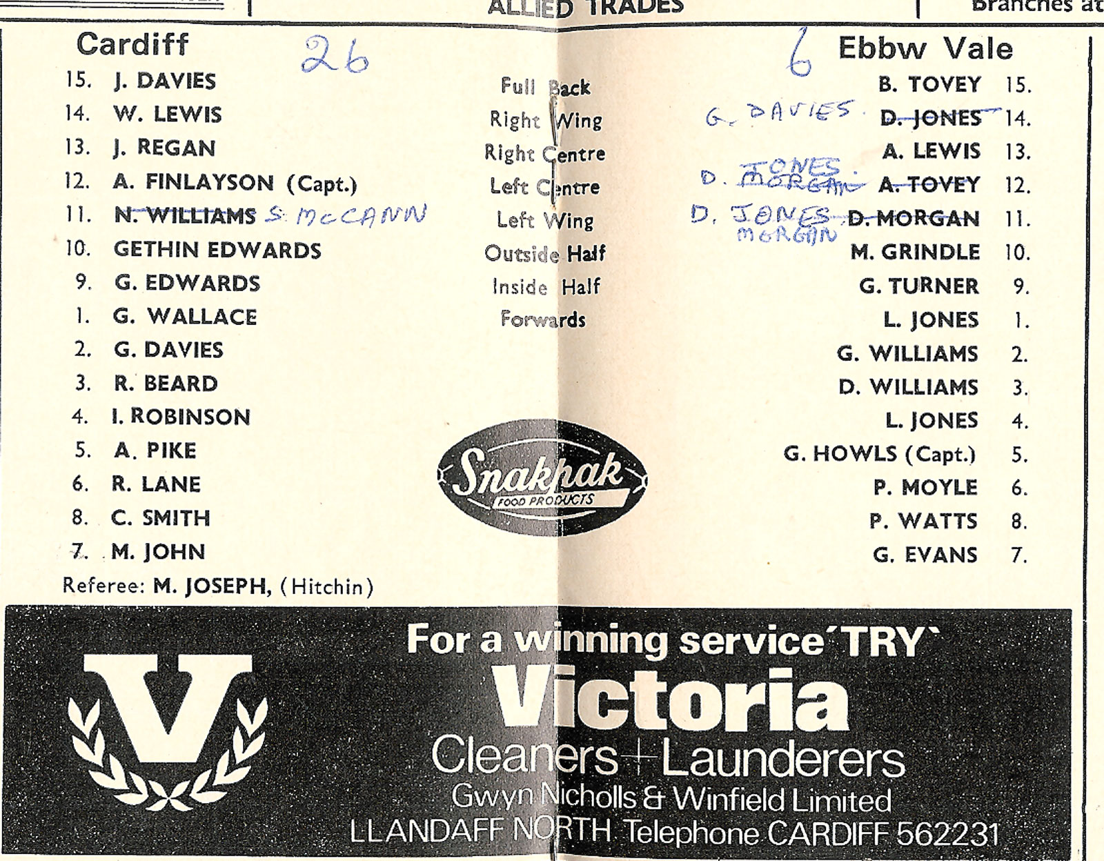 Cardiff v Aberavon | 24 Sep 1977 | Cardiff | 28-13 |
