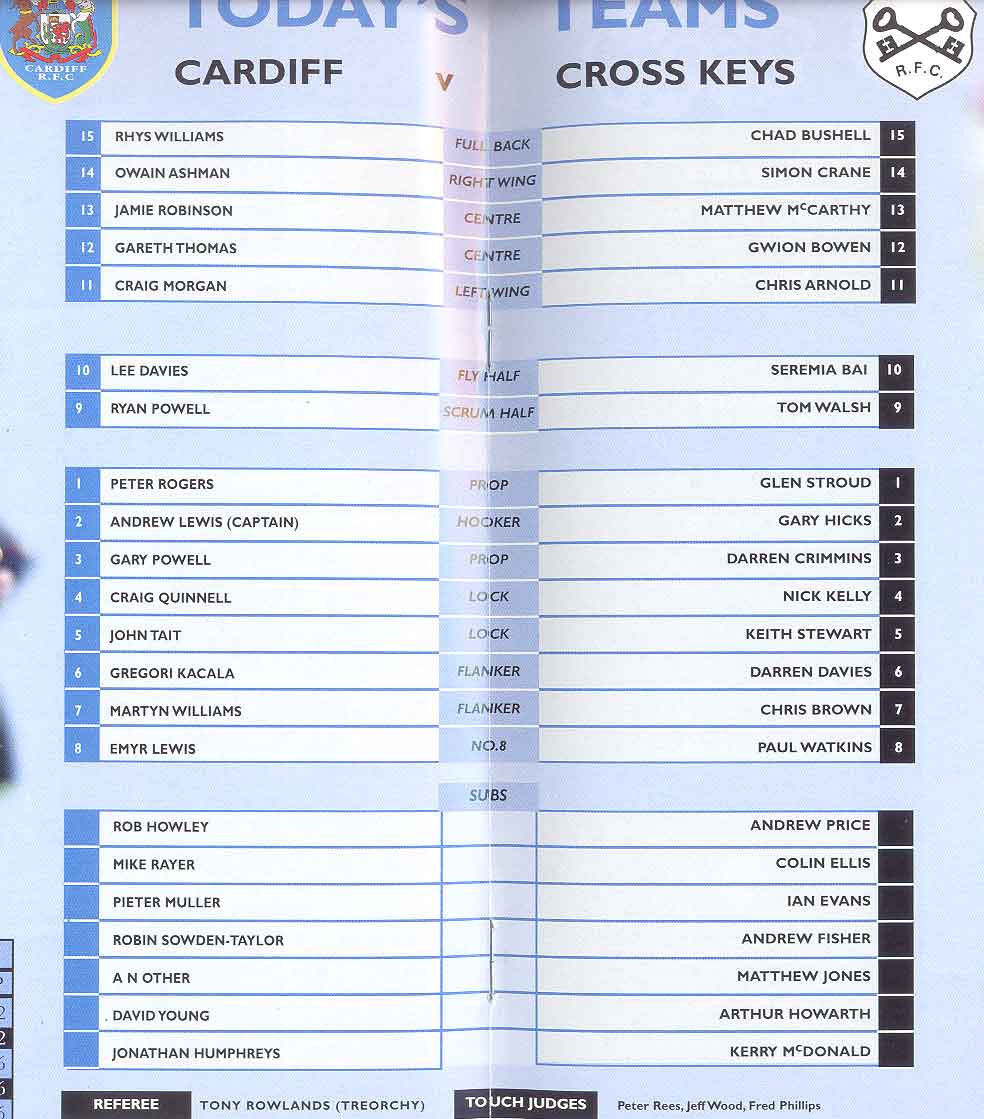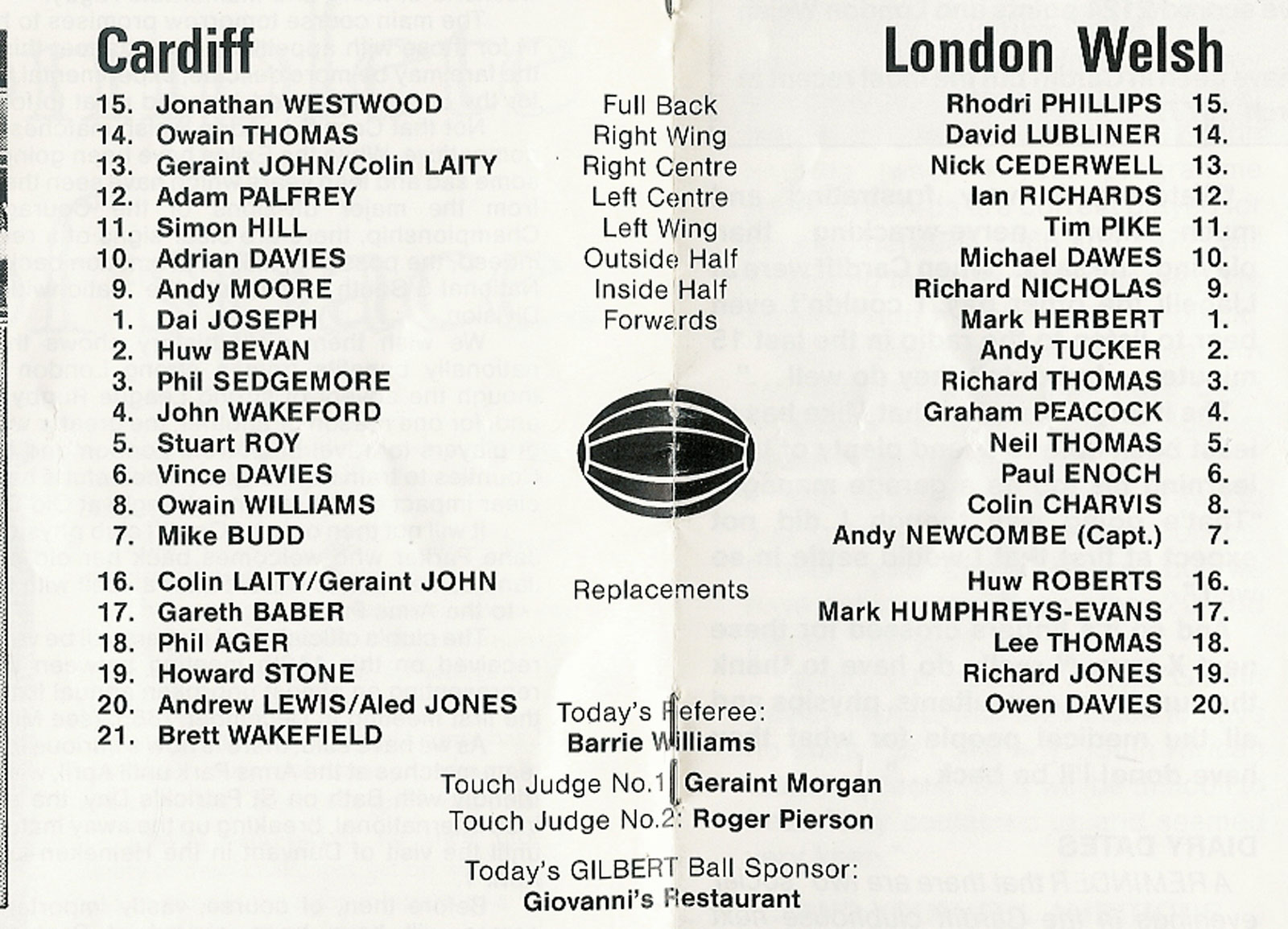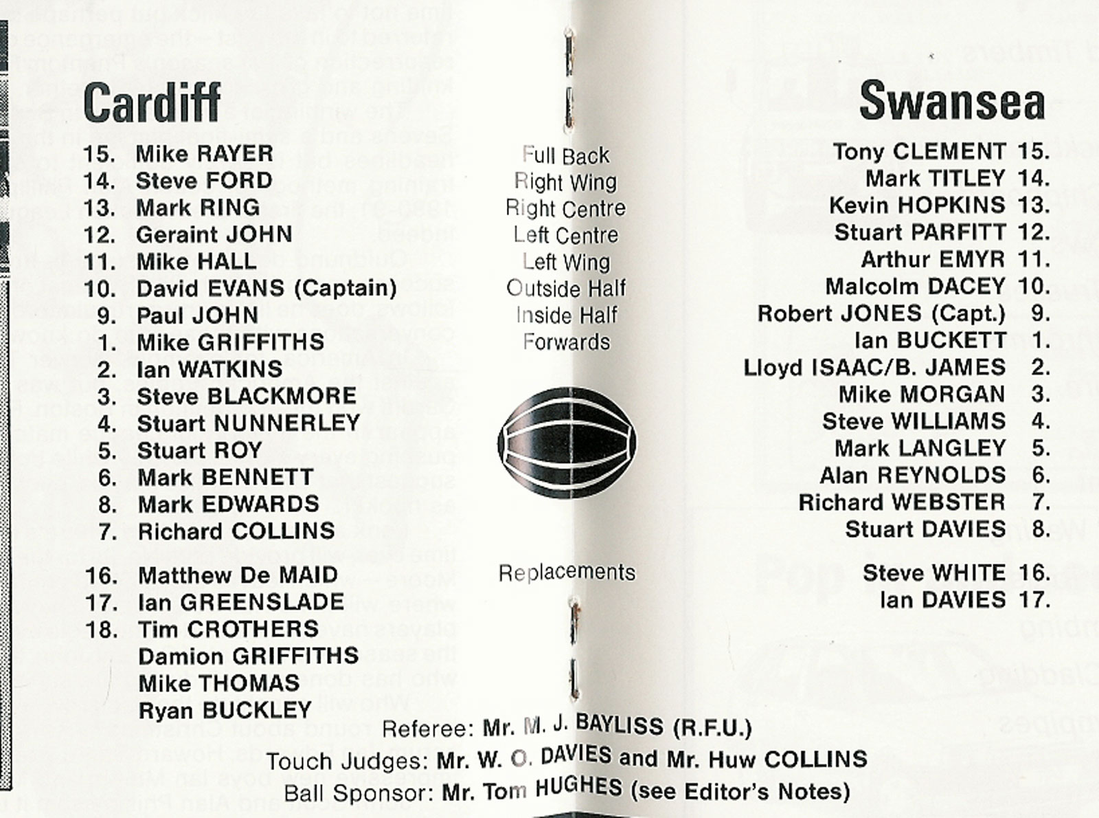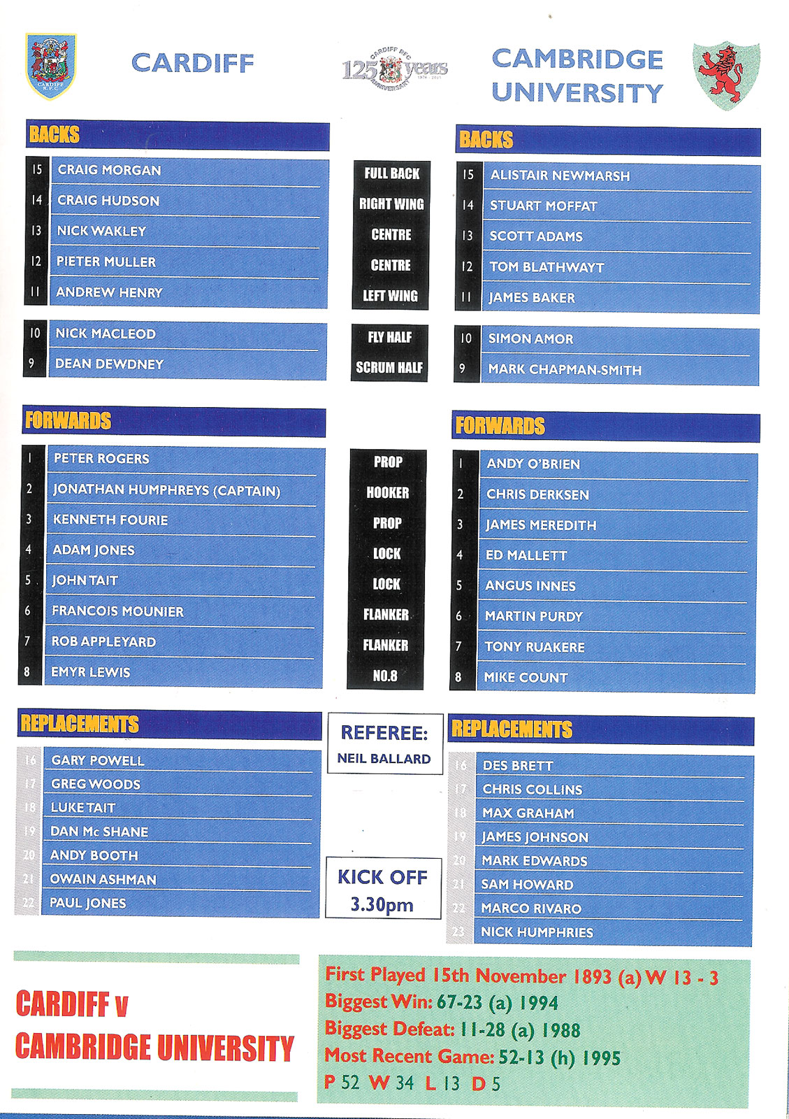 for Cardiff RFC away programmes please visit our other club programme pages......... Aberavon - Bath - Bridgend - Ebbw Vale - English Clubs - Gloucester - Irish Clubs - Irish Provincial - Llanelli & Scarlets - Maesteg - Neath - Newbridge - Newport - Pontypool - Pontypridd - Saracens - Scottish Club - Swansea - Welsh Clubs |