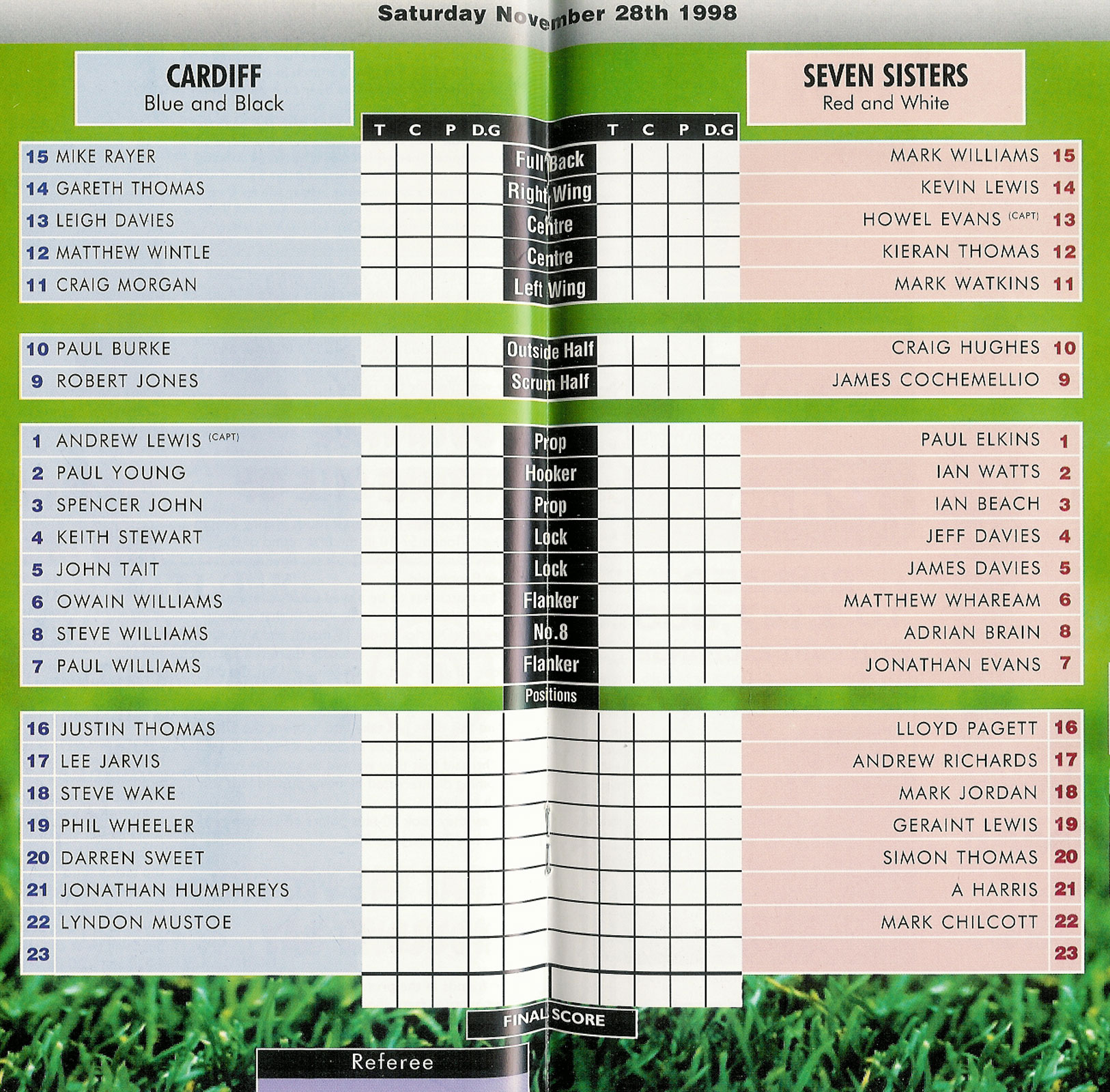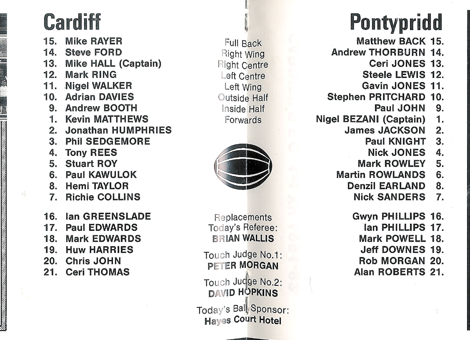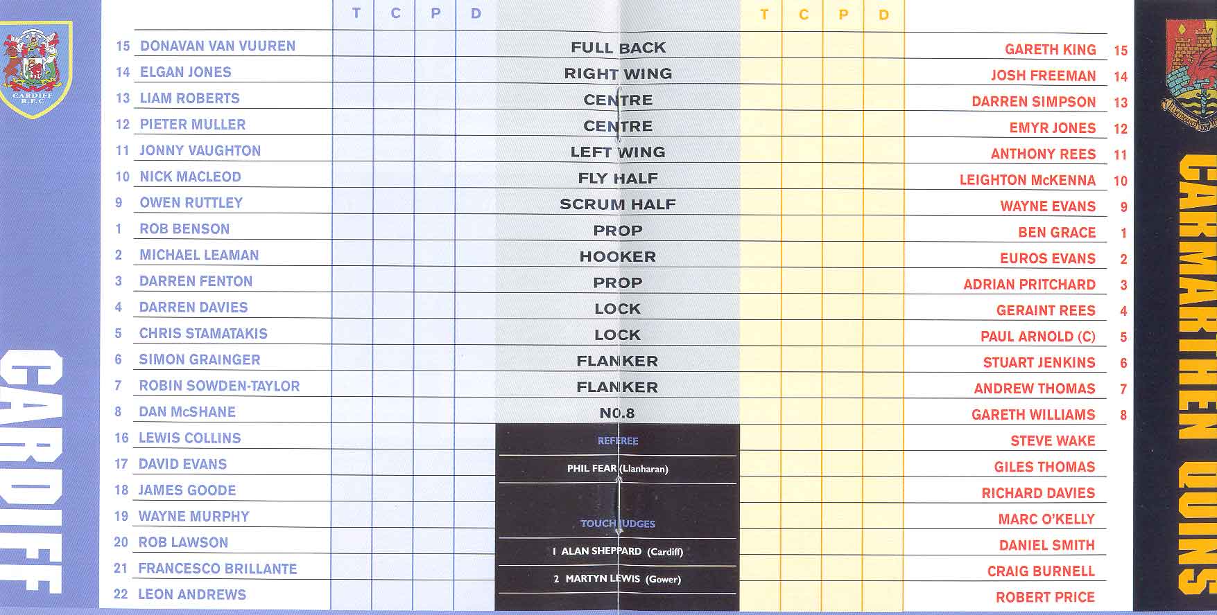 for Cardiff RFC away programmes please visit our other club programme pages......... Aberavon - Bath - Bridgend - Ebbw Vale - English Clubs - Gloucester - Irish Clubs - Irish Provincial - Llanelli & Scarlets - Maesteg - Neath - Newbridge - Newport - Pontypool - Pontypridd - Saracens - Scottish Club - Swansea - Welsh Clubs |