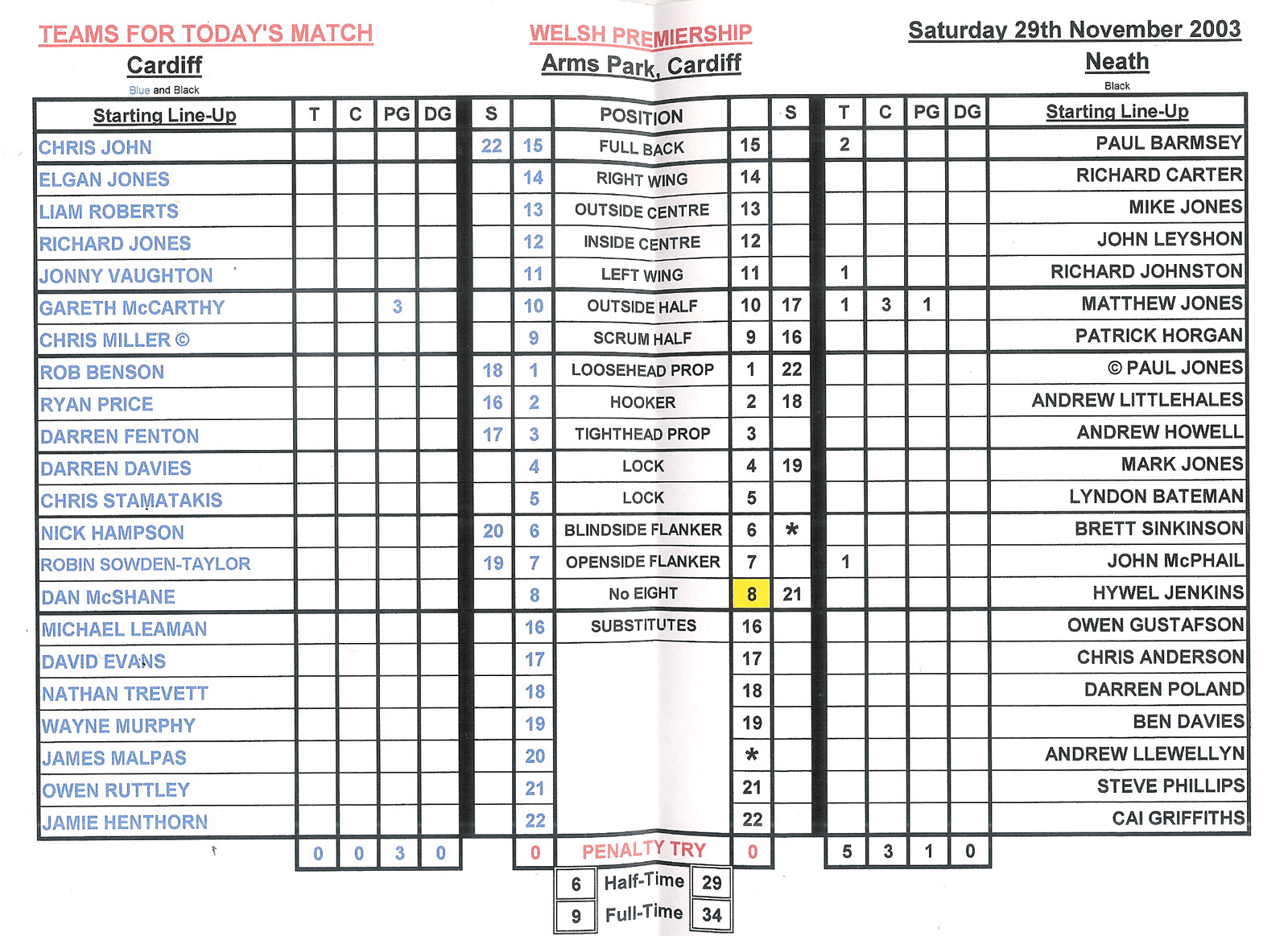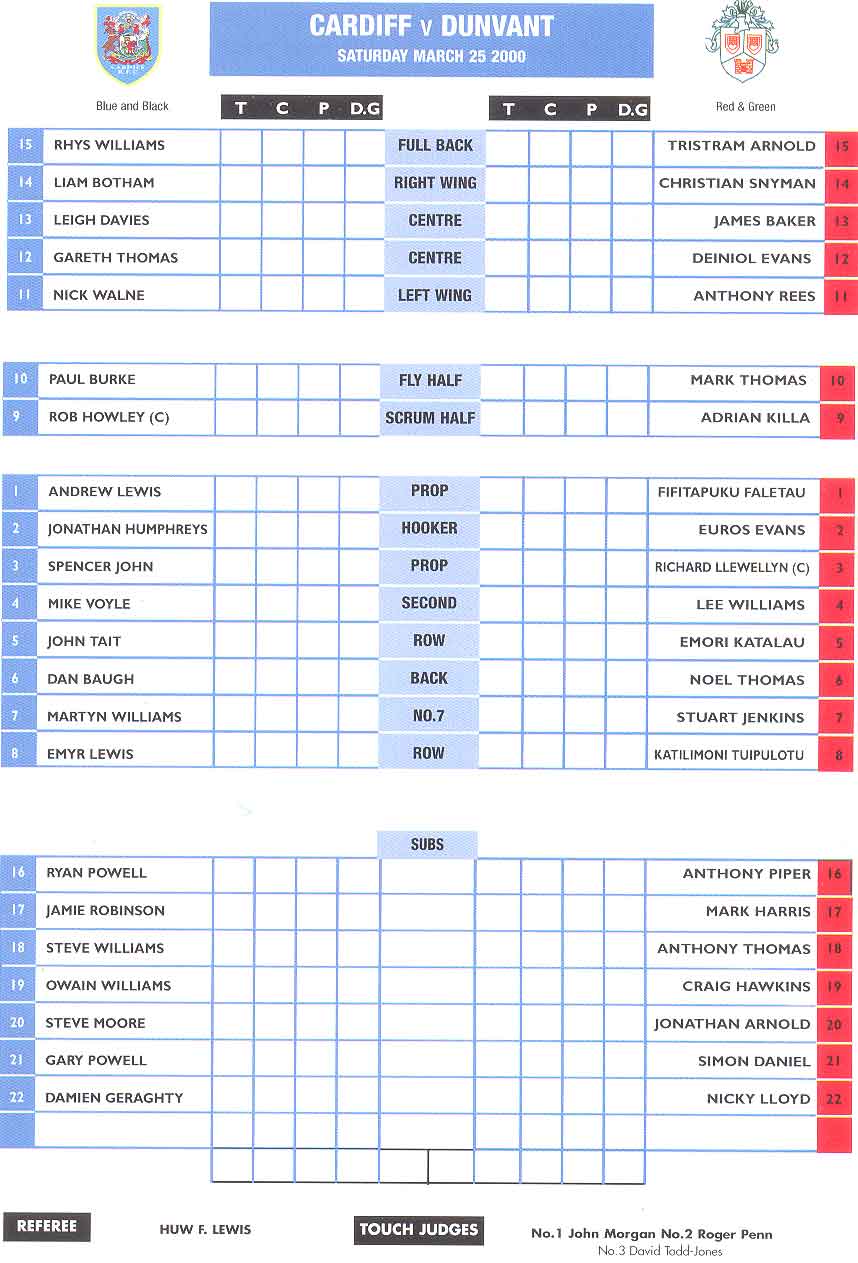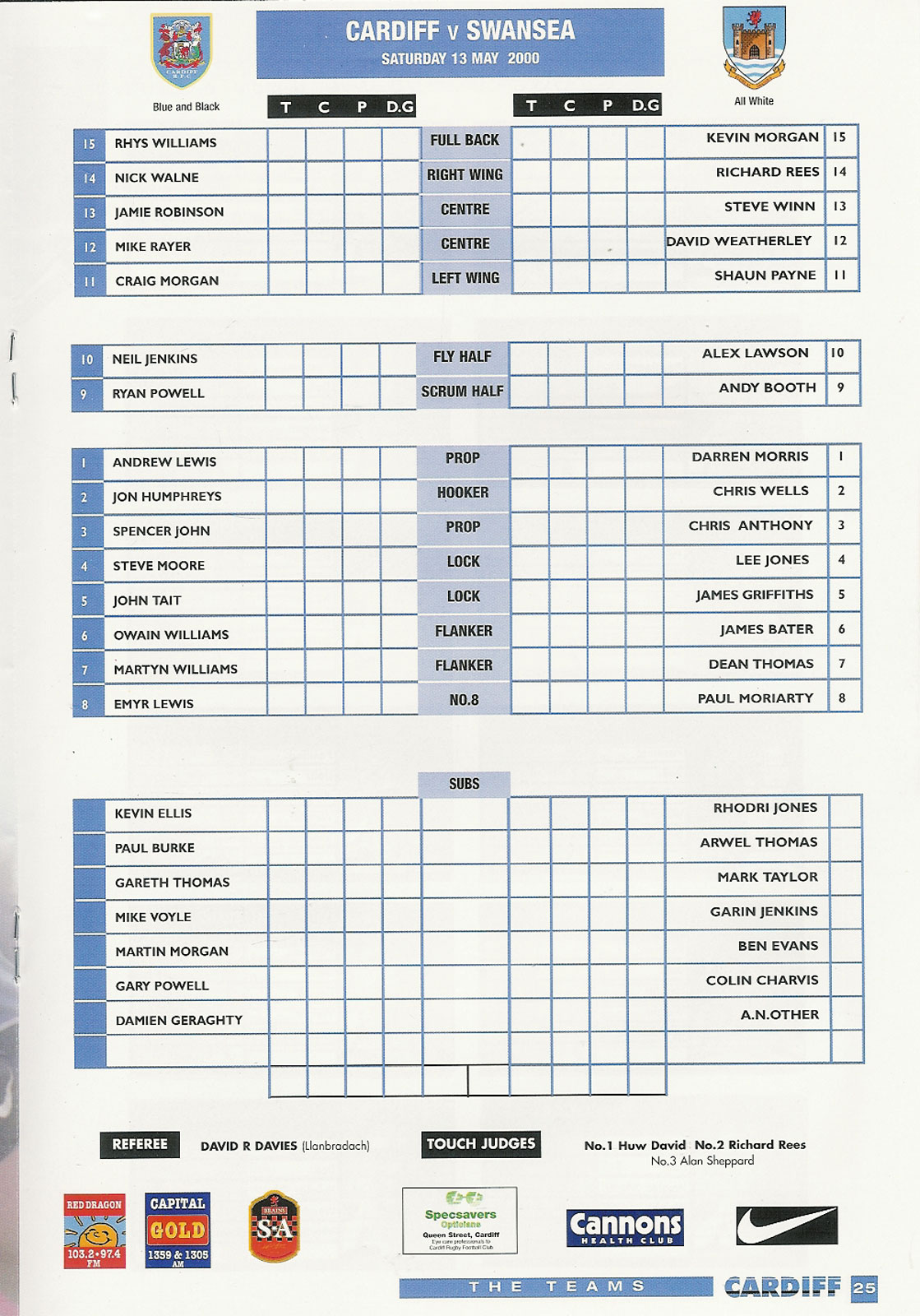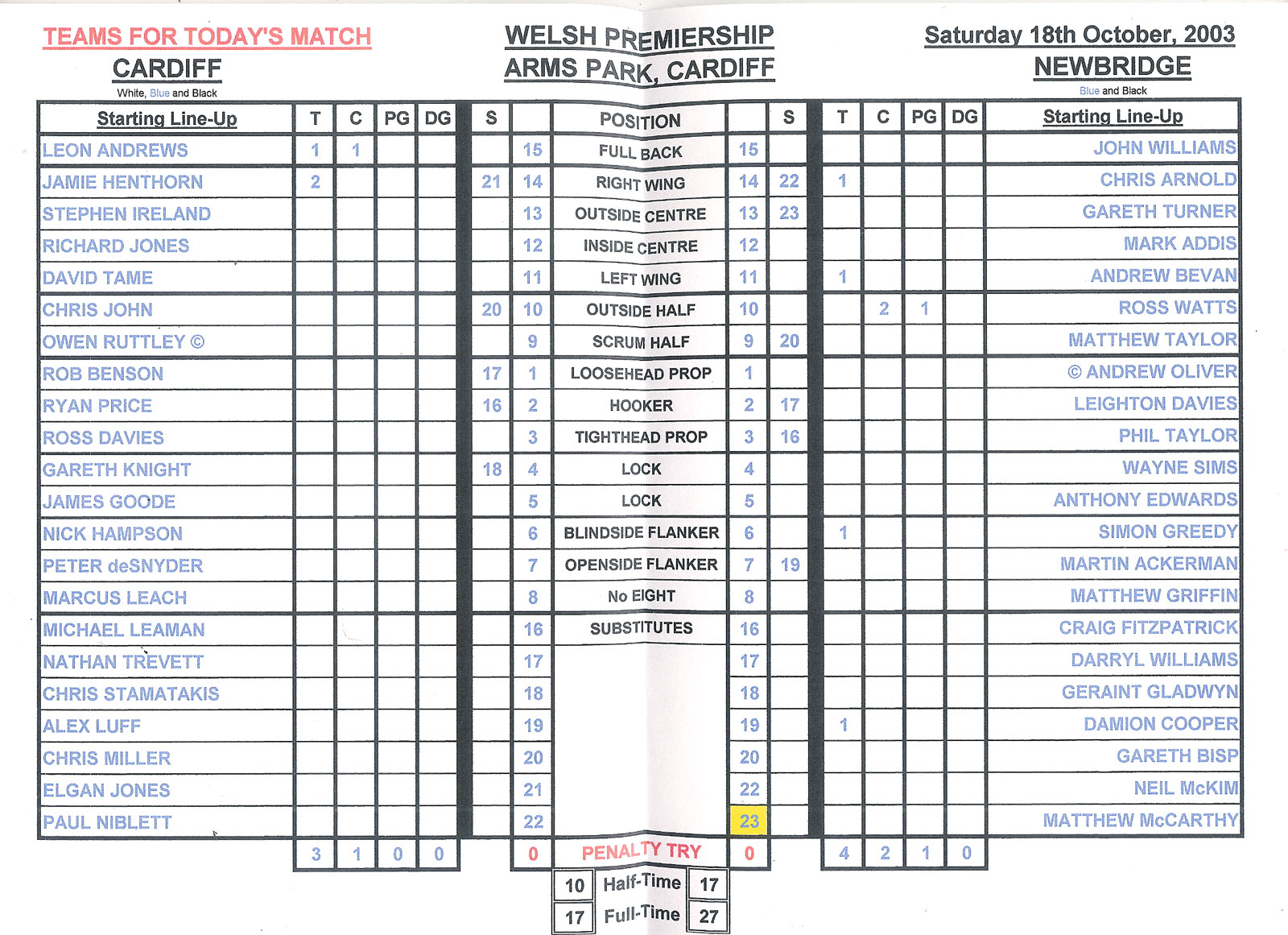 for Cardiff RFC away programmes please visit our other club programme pages......... Aberavon - Bath - Bridgend - Ebbw Vale - English Clubs - Gloucester - Irish Clubs - Irish Provincial - Llanelli & Scarlets - Maesteg - Neath - Newbridge - Newport - Pontypool - Pontypridd - Saracens - Scottish Club - Swansea - Welsh Clubs |