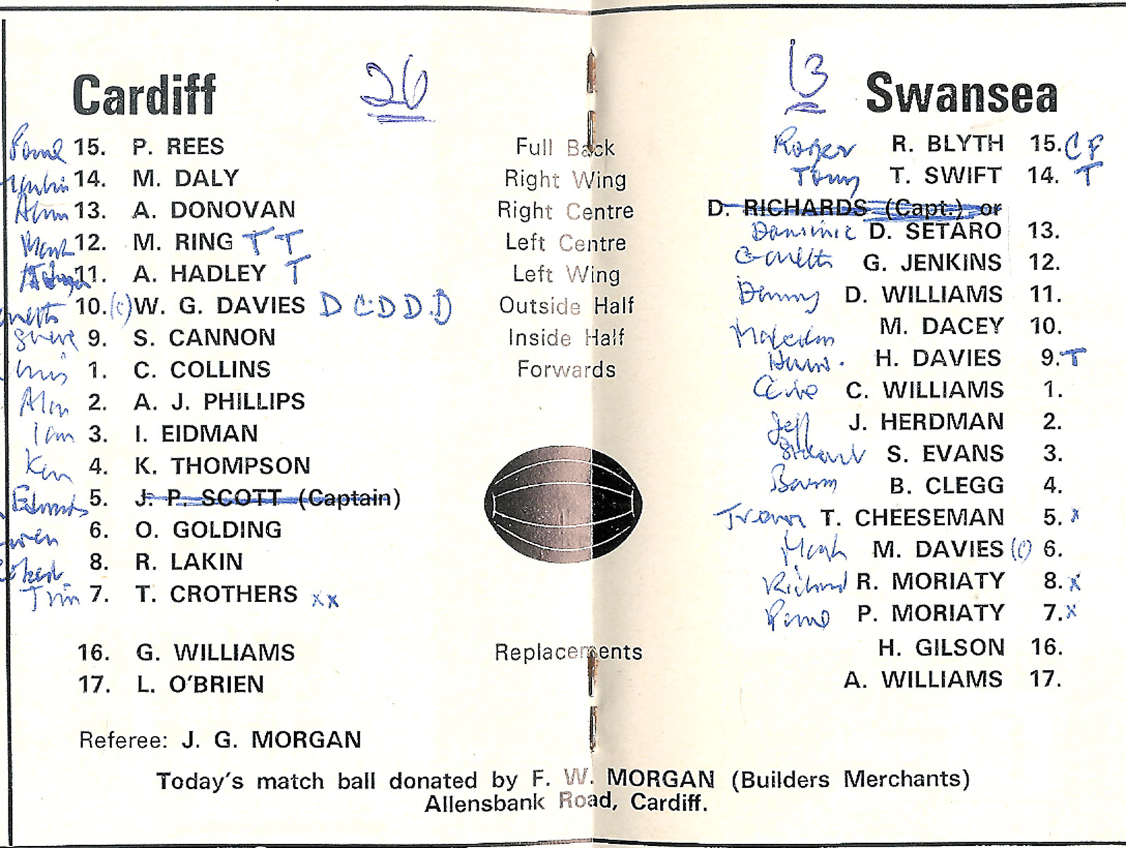 Cardiff v Swansea | 3 Dec 1977 | Cardiff | 10-6 | good - slight crease Ref: PC12-prcb-cdf19771203swa* - £2.00 |