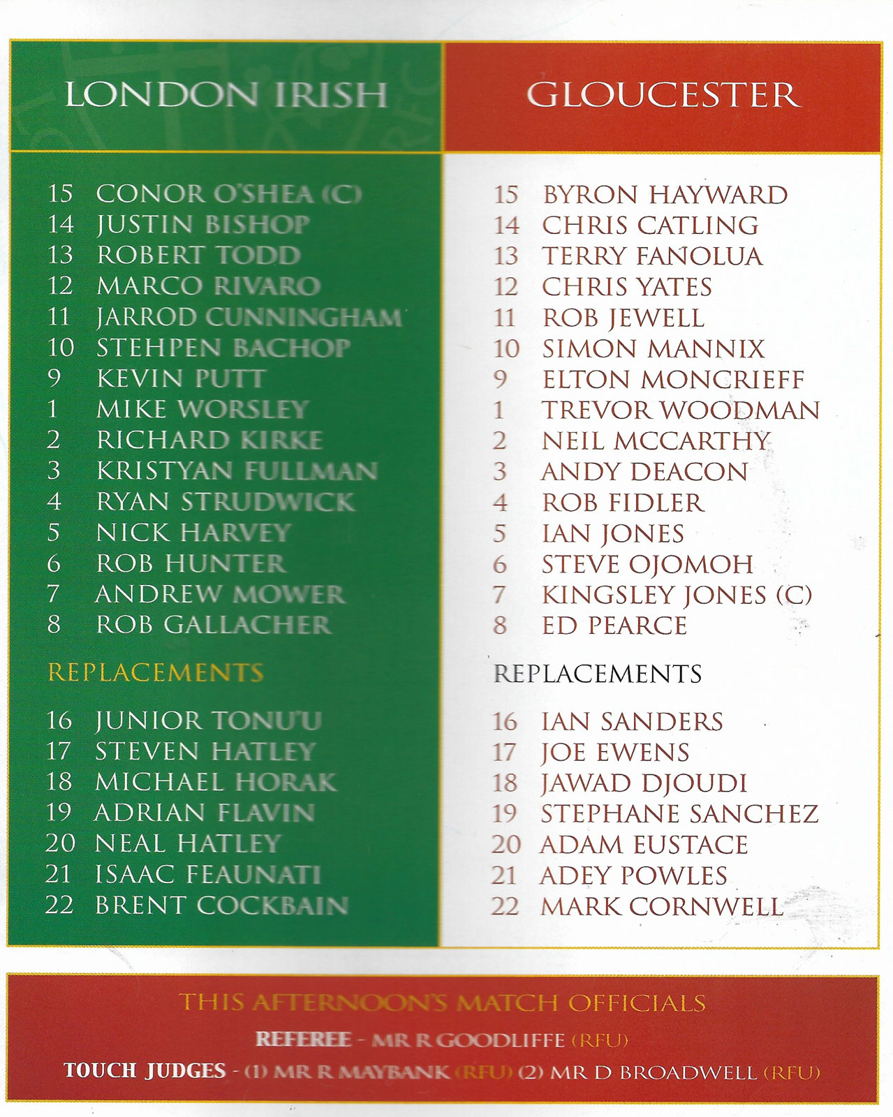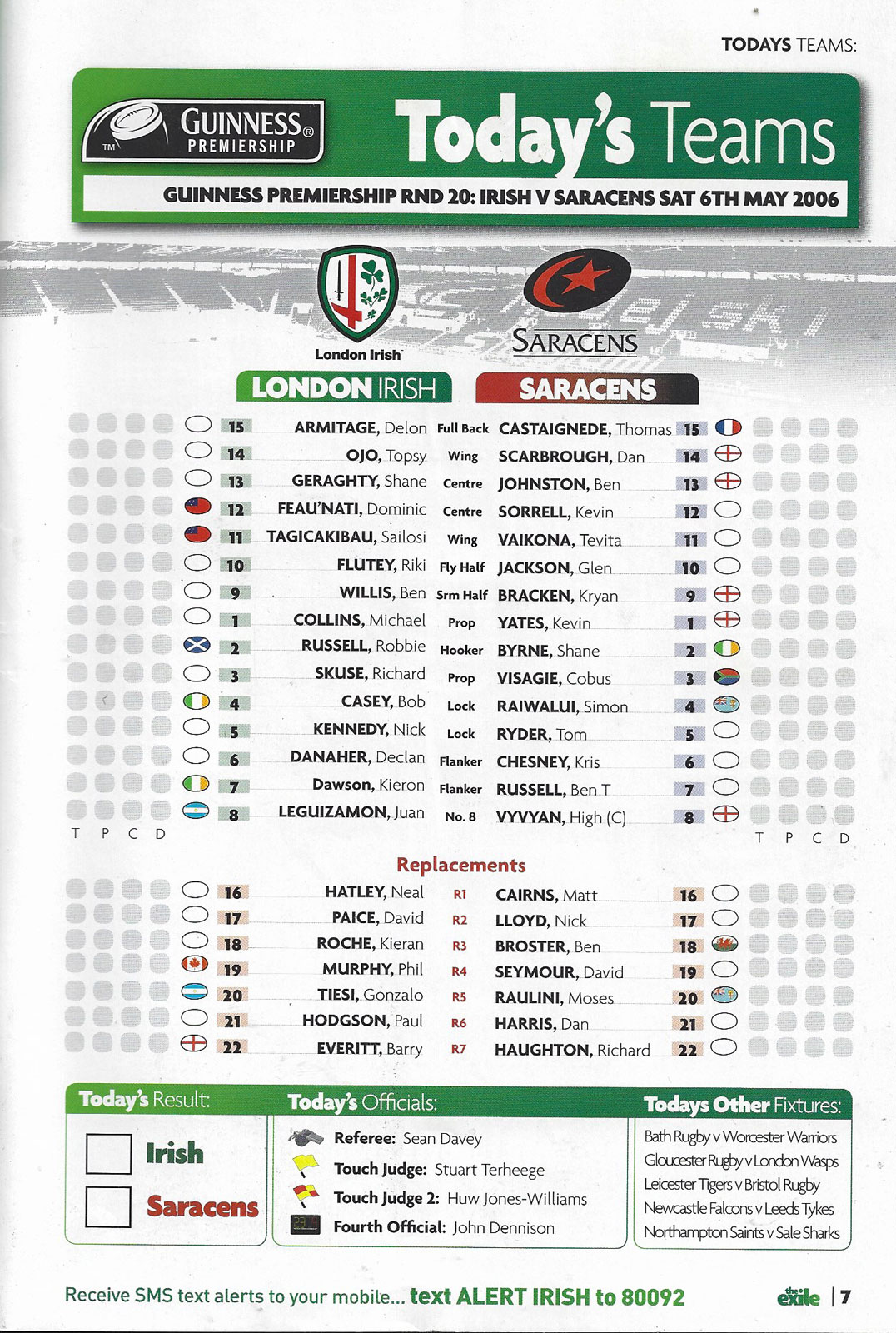 for London Irish away programmes please visit our other club programme pages......... Aberavon - Bath - Bridgend - Cardiff - Ebbw Vale - English Clubs - Gloucester - Irish Clubs - Irish Provincial - Llanelli & Scarlets - Maesteg - Neath - Newbridge - Newport - Pontypool - Pontypridd - Saracens - Scottish Club - Swansea - Welsh Clubs |
