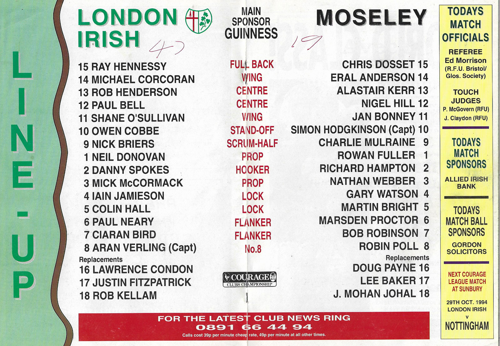 London Irish v Northampton | 29 Jan 1994 | London Irish | very good Ref: RC542-F-prcb-loi19940129nor - £4.00 |
