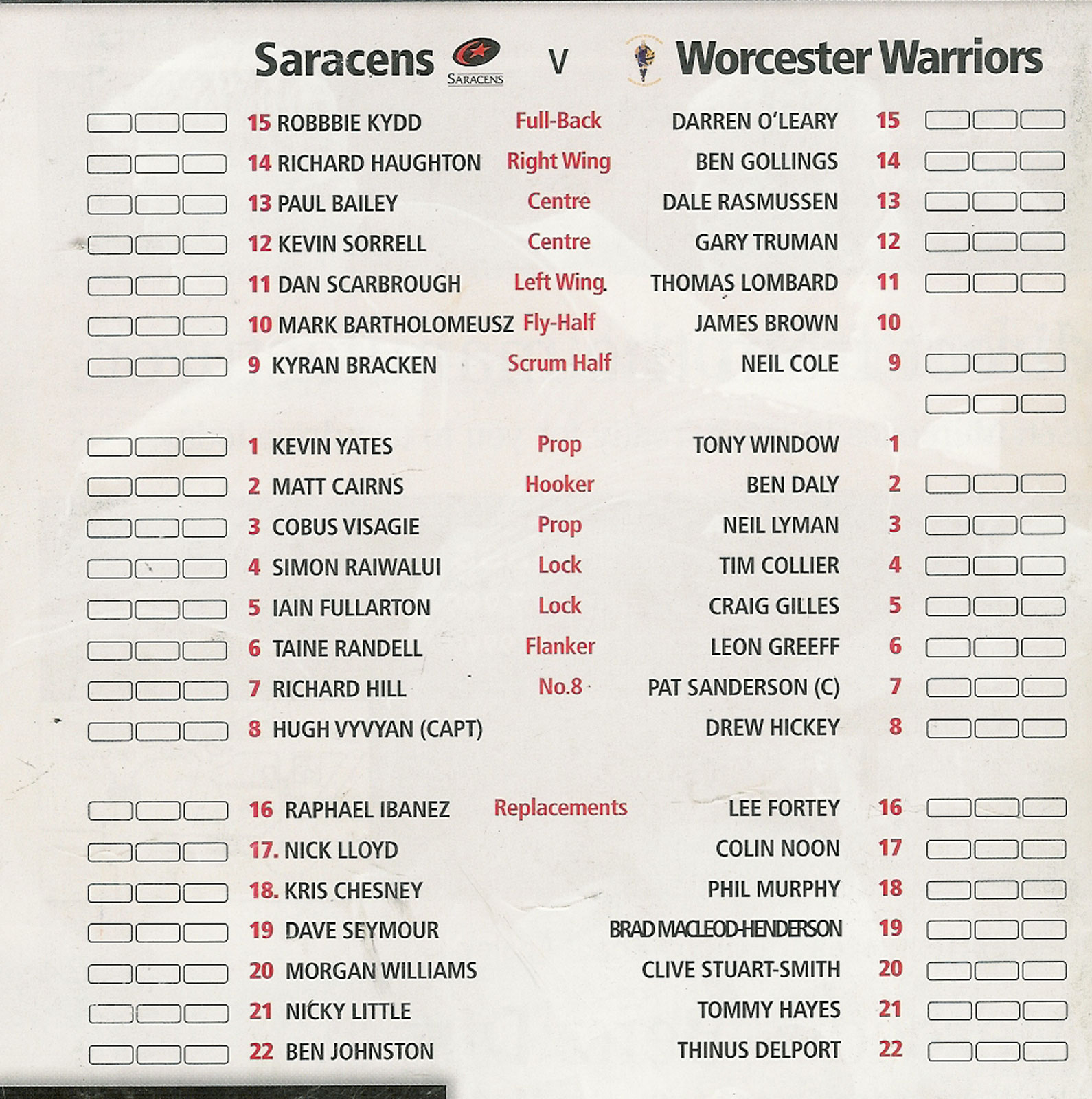 1 Mar 2009 Saracens   good - small tear bottom left hand corner