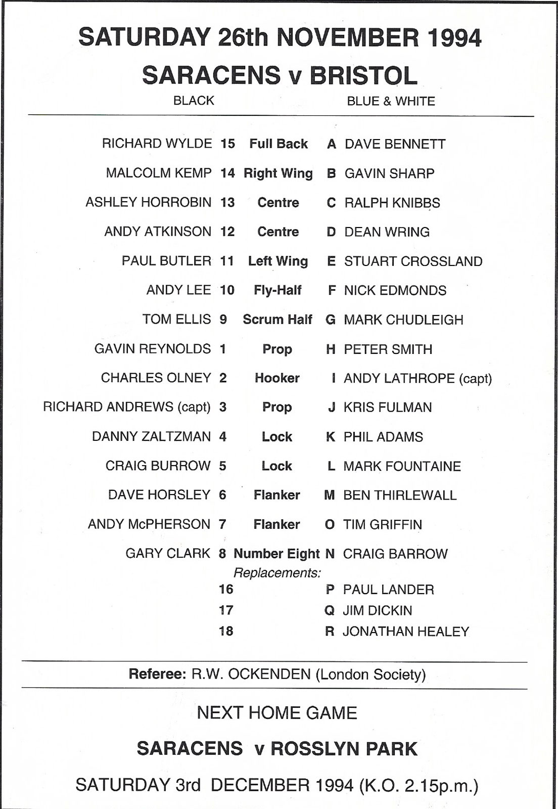 20 Nov 2005 Saracens   very good