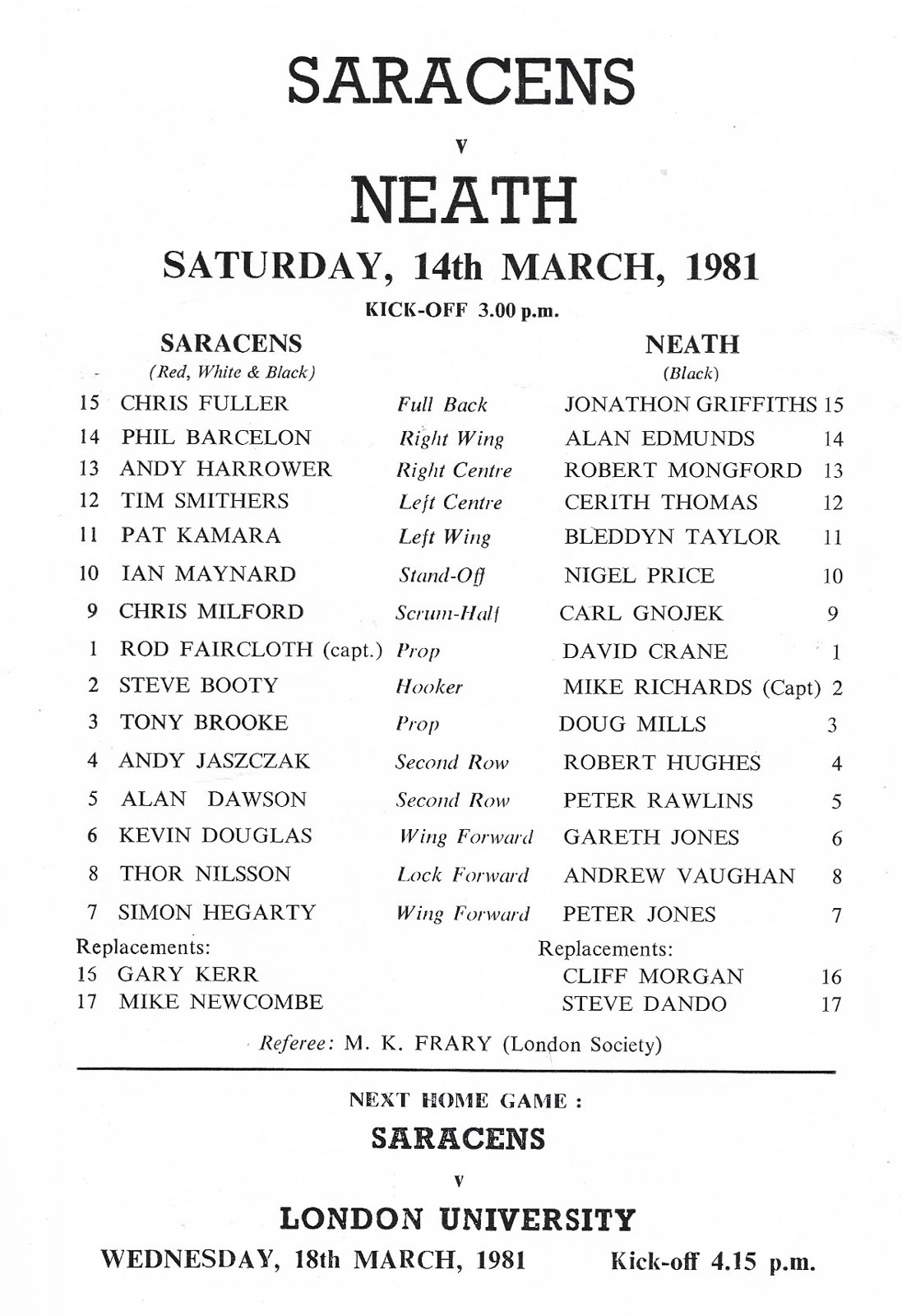 14 Mar 1981 Bramley Sports Ground, Southgate   very good