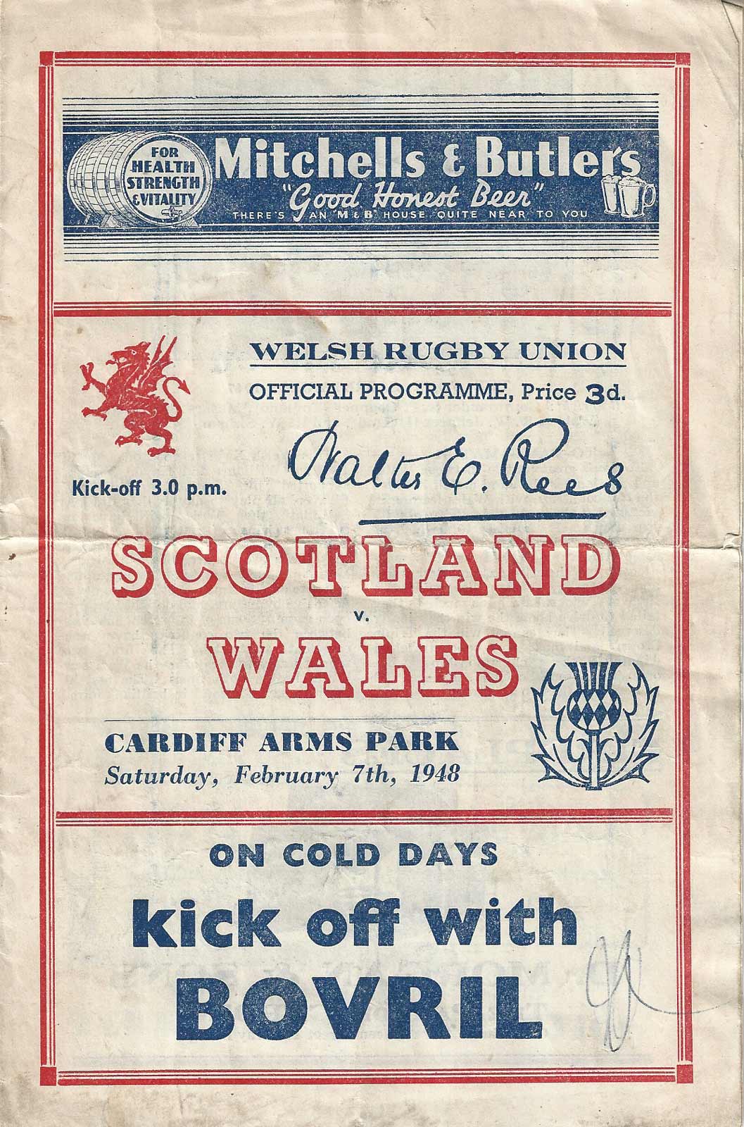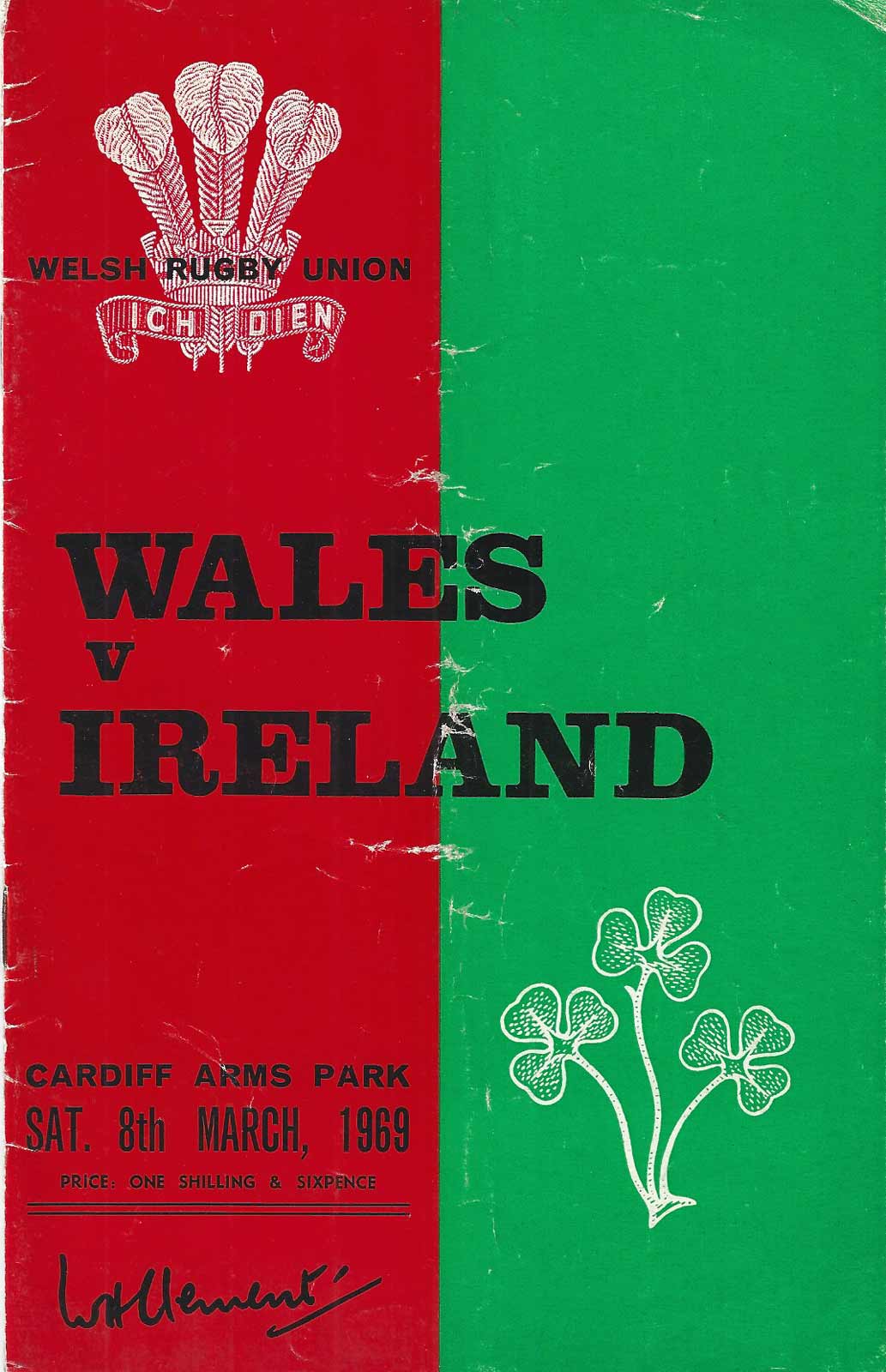 creases, name on front, Welsh try scorers marked on middle pages