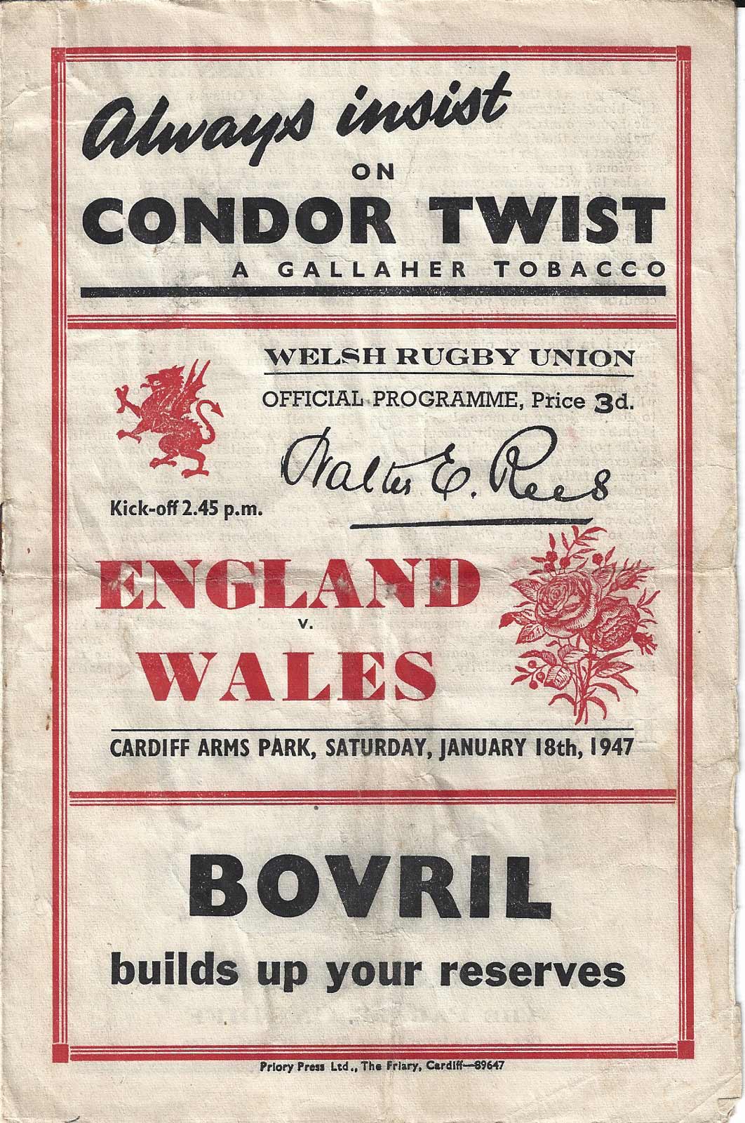 15 Jan 1949 | Cardiff | 9-3 | very good Ref: LR-prinwaen1949 - £10.00 |