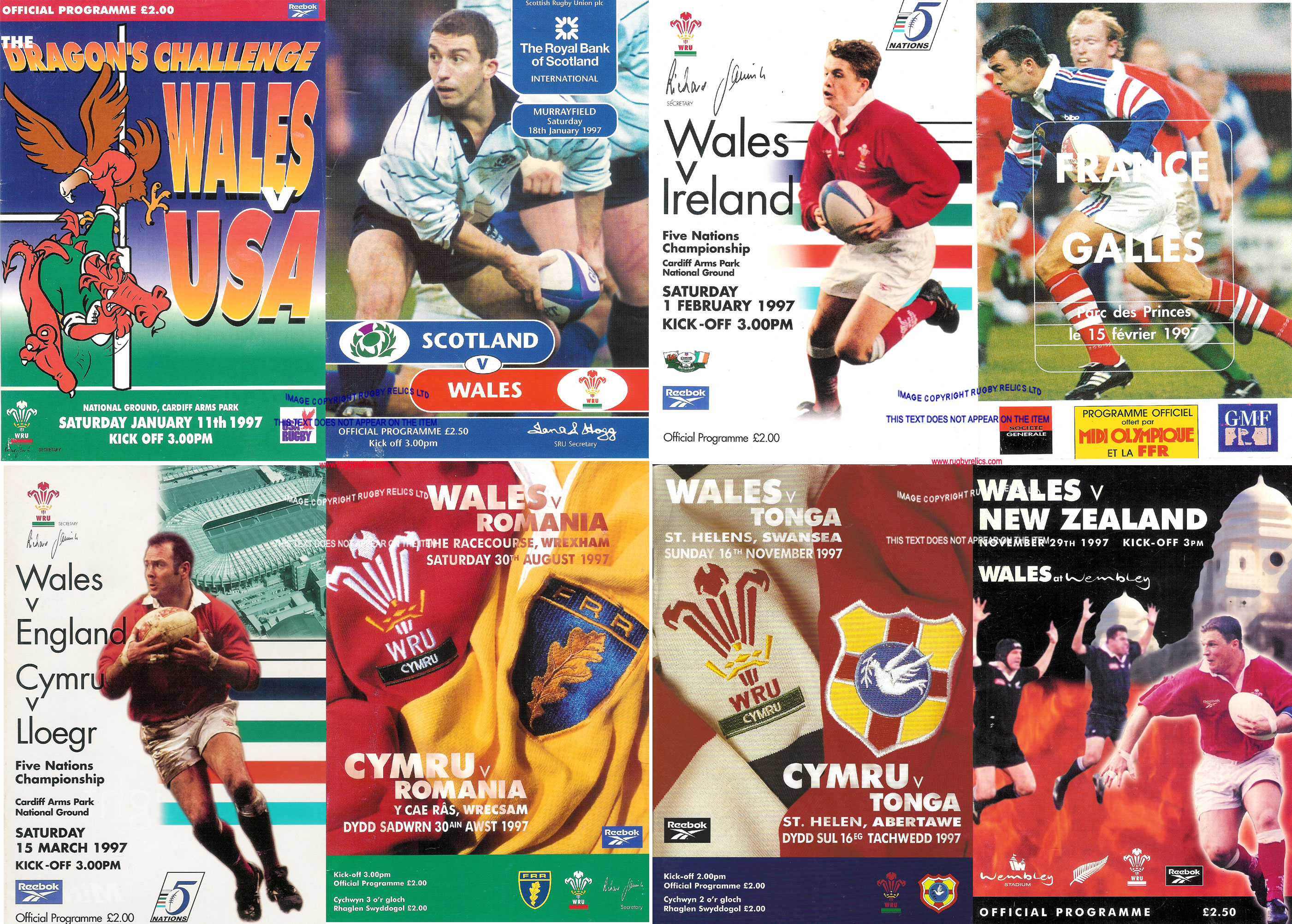 A group of 8 programmes for matches played by Wales in 1997. The set includes all 4 official programmes from the matches played by Wales in the Five Nations tournament together with the programmes against overseas opposition. Please see below for more information and the condition of each programme.