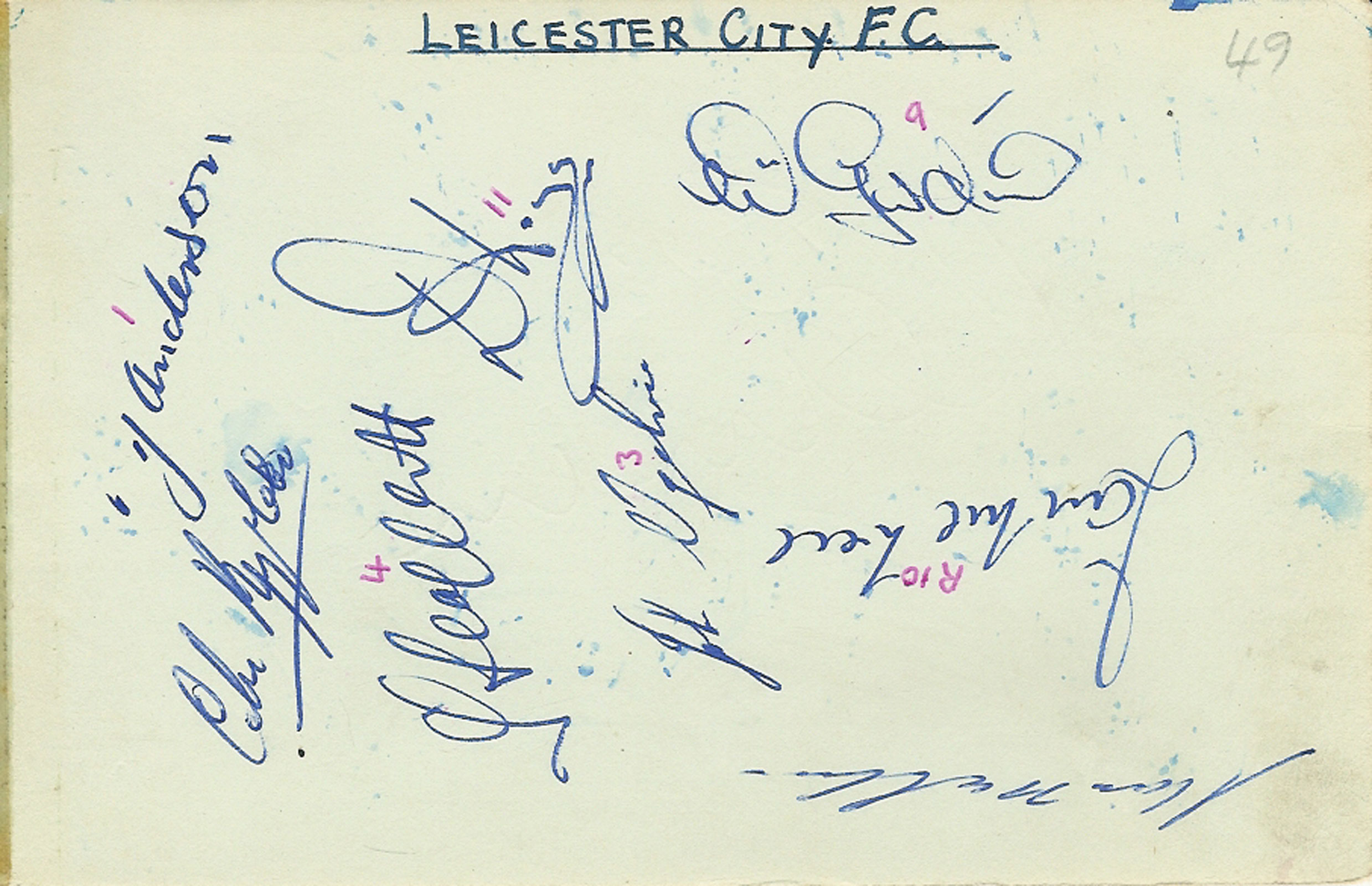 49.jpg (521122 bytes) 49b.jpg (437781 bytes) LEICESTER CITY / WEST BROM 1960s ALBUM PAGE SIGNED by 8 Leicester and 2 West Brom. Sold together with a COA guaranteeing that the autographs are original and authentic.