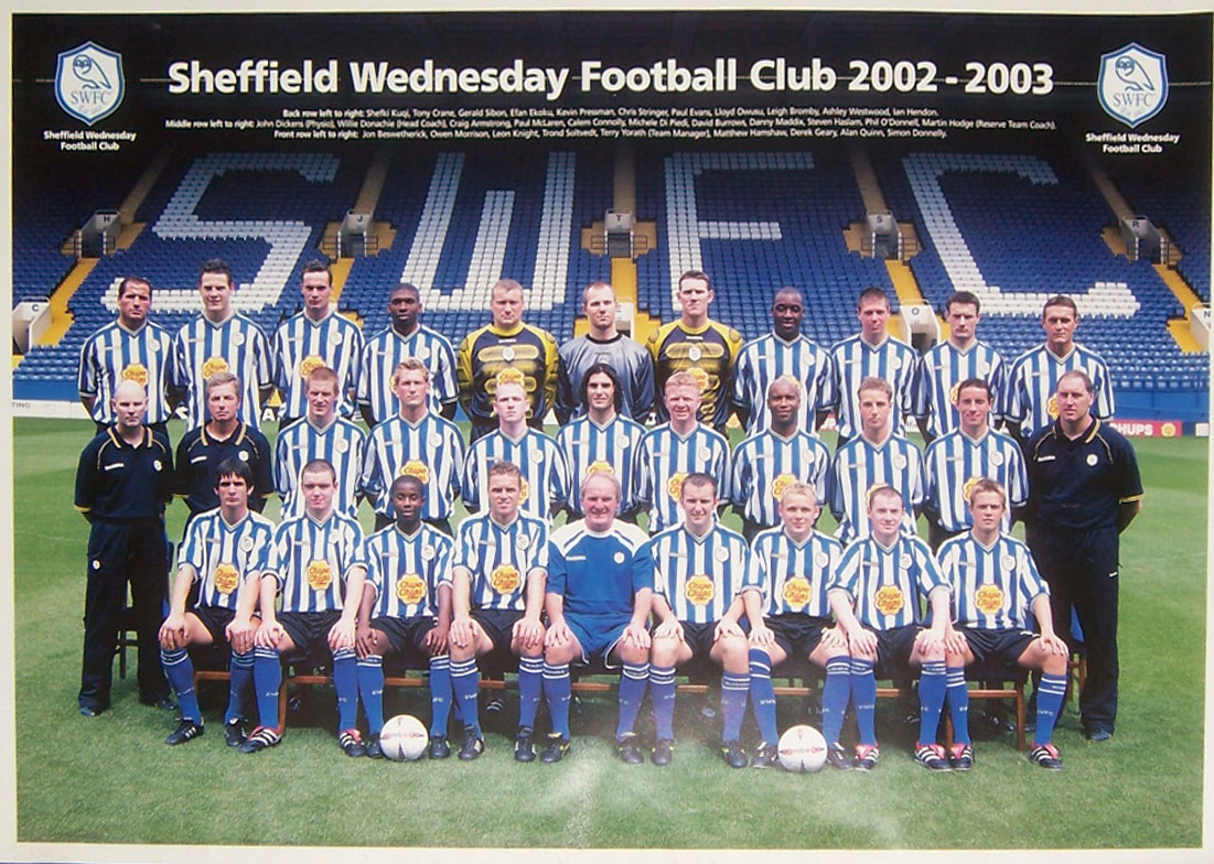 70.jpg (272877 bytes) Sheffield Wednesday 2002-03, squad photo,  23" x 16" - 59 x 41cm. Overall condition good but with some light creasing near the bottom edge